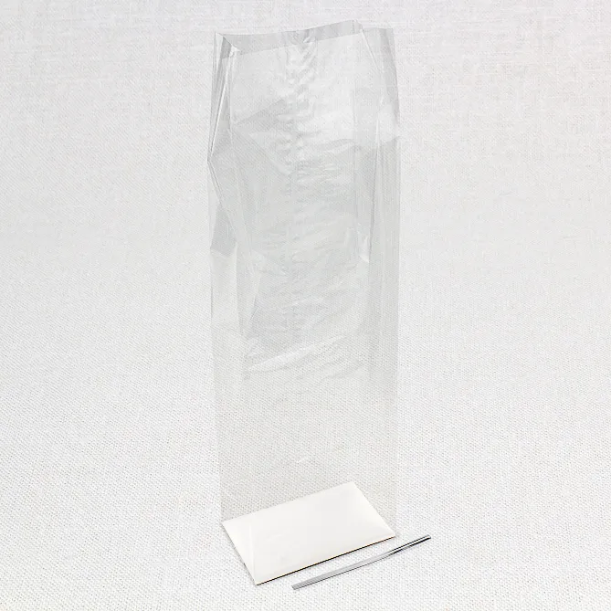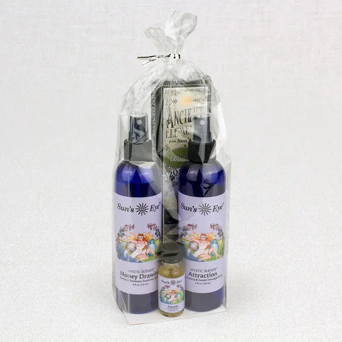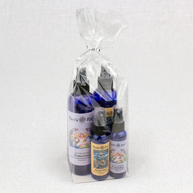 A clear gift bag with silver twist tie for packaging the perfect gift of 2 large and 2 mini mists or 2 large mists, a box of incense and 1 oil.